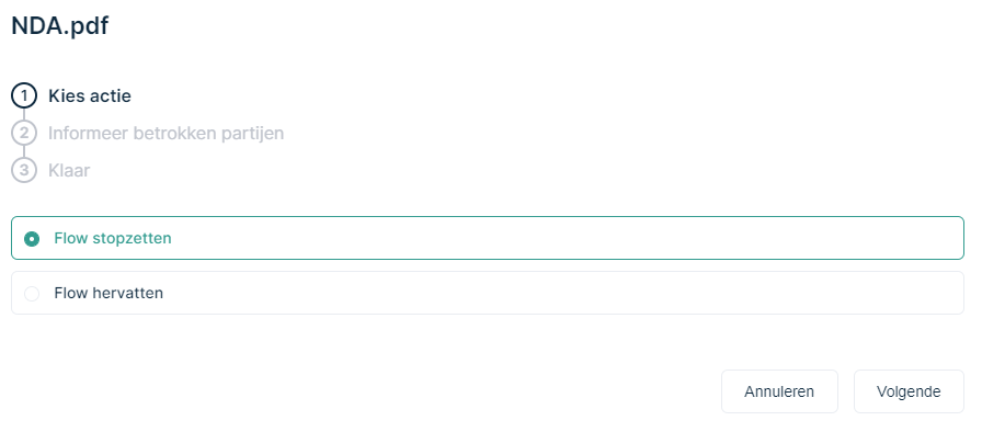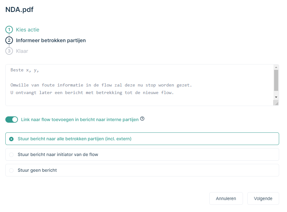 Je kan er voor kiezen om de betrokken partijen te informeren over het stopzetten van de flow, of om deze stop te zetten zonder de partijen te informeren.