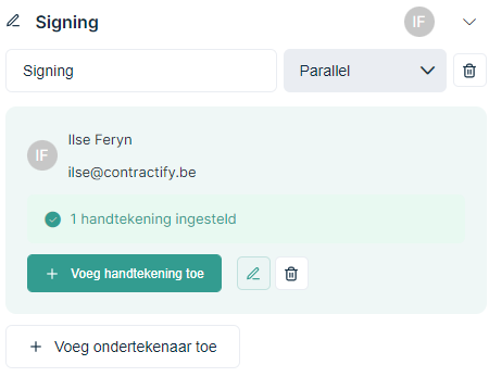 In dit geval klik je op het vuilnisbak icoontje en verwijder je de ondertekenaar met het foute emailadres. Vervolgens kan je opnieuw een ondertekenaar toevoegen met de juiste informatie.