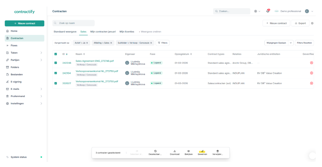 Door de contracten te selecteren met de checkbox aan de linkerkant, zal er onderaan een balk verschijnen waar we al onze bulk-acties kunnen vinden. We kunnen in bulk alle geselecteerde contracten bewerken.
